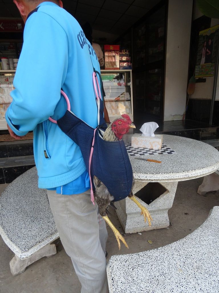 on croyait avoir tout vu en matière de transport,...ce coq ne terminera certainement pas en pâté.