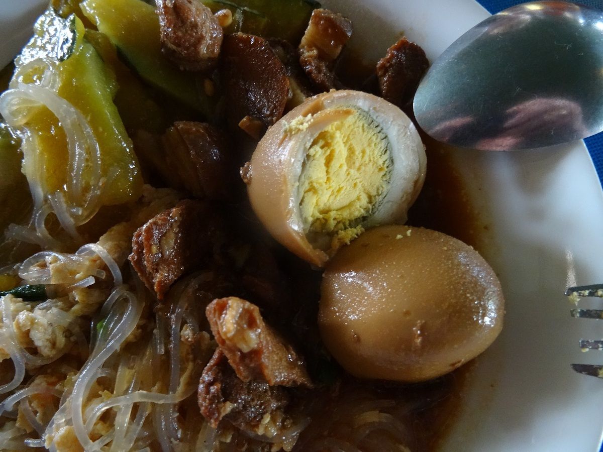 Puis l' arrêt buffet, au menu : nouilles, oeufs durs , porc,